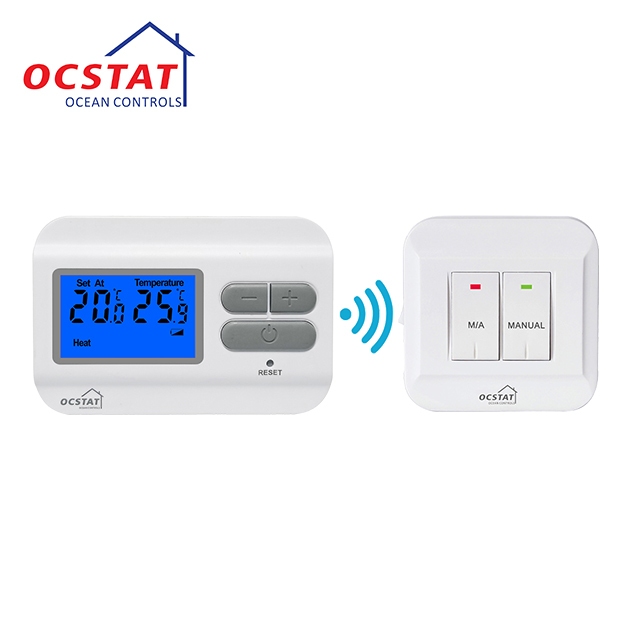 A1: The Wireless Room Thermostat is from the brand OCSTAT, and the model number is ST2301RF.